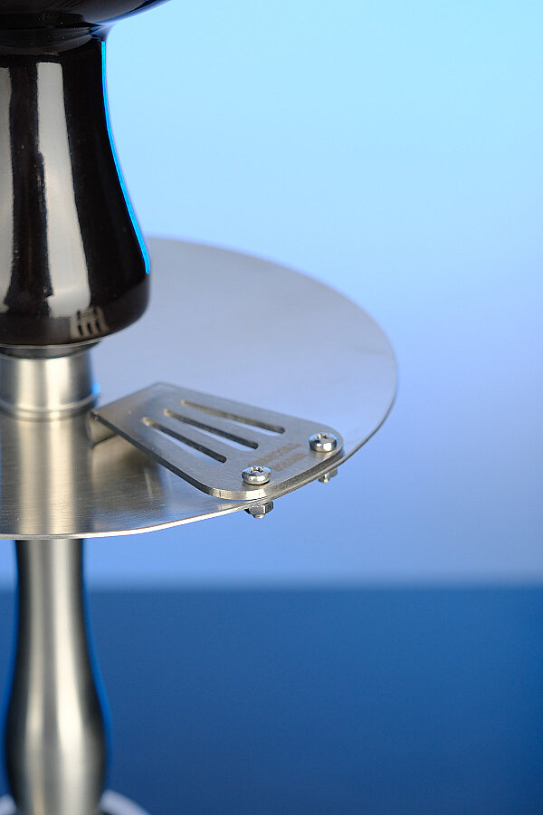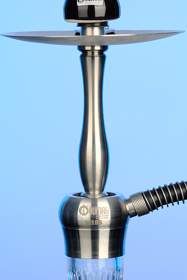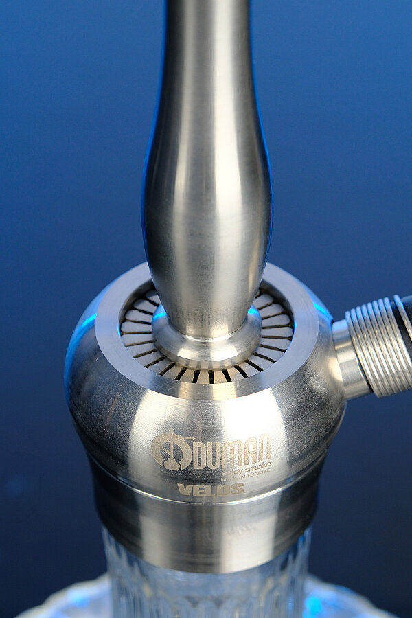 Geleneksel-modern füzyon tasarıma sahip orta boy paslanmaz çelik nargile. Zarif dilimli cam taban, cilalı çelik gövdeyle birleşerek modern mühendislik üzerine kurulu klasik bir görünüm sunar. 36 cm yüksekliğiyle Velos hem masa üstünde hem yerde rahatça kullanılabilir. Tepsi üzerindeki kömür ızgarası, kömürlerin söndürülmeden bekletilmesini sağlar. Gümüş, Bronz ve Altın renk seçenekleri mevcuttur. Tek marpuç, 16 cm genişlik, 3 kg.